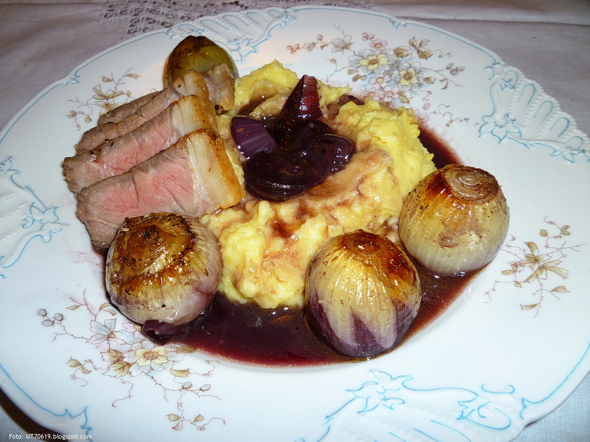 Kartoffelgulasch in der vegetarischen Variante, aber sooo lecker mit einem Klecks Sauerrahm drauf.Es haut uns jedes Mal fast wieder um, wie gut so einfache Zwiebeln schmecken können. Wir hatten Kartoffelpüree und ein wenig Roastbeef zu den karamellisierten Ofenzwiebeln.